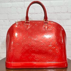 “This is an authentic LOUIS VUITTON Vernis Alma GM in Pomme D'Amour. This stylish Alma tote is crafted of Louis Vuitton monogrammed embossed vernis patent leather in a shade of red. The bag features rolled leather top handles, a sturdy base, a wrap-around zipper, and a lock. This handbag opens to a spacious matching fabric interior with patch pockets. This is an excellent tote for everyday use, from Louis Vuitton!”