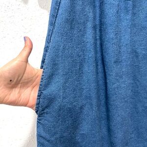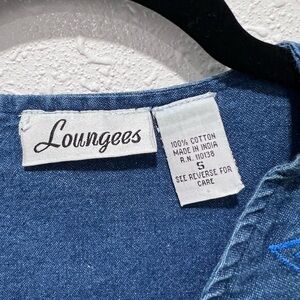 PREOWNED dress made of dark denim. It features a V-neckline with butterfly embroidery, short sleeves, and a midi length. It is designed for comfort and casual wear, suitable for both indoor and outdoor activities. It is a versatile piece that can be styled in multiple ways