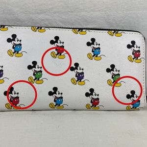 This item is new with tags. However, this wallet has what some would consider flaws, as highlighted in the photos above. Although it may be difficult to see in the photos, there is some transfer in places on the rear of the wallet.