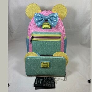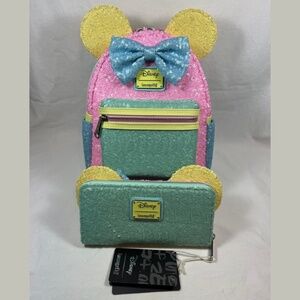LOUNGEFLY Minnie Mouse Pastel Sequin Backpack + Wallet