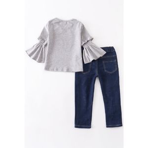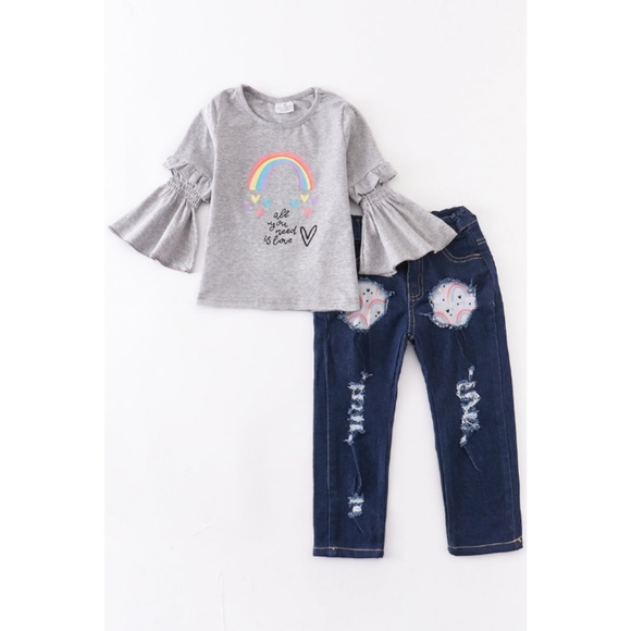 GREY RAINBOW HEARTS RUFFLE TOP AND JEANS SET.