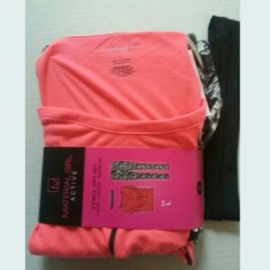 Super cute and fun for working out or just hanging out! Set includes scoop neckline t-shirt, printed leggings and a headband. Material polyester/spandex.