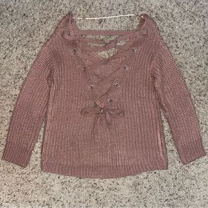 LOVE AT FIRST SIGHT CRISS CROSS BOW KNIT SCOOP NECK SWEATER / PINK / SIZE MEDIUM
