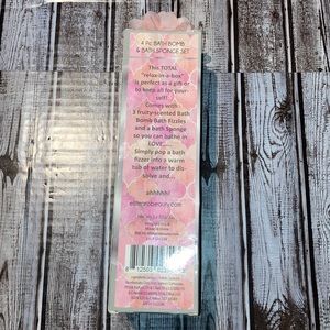 “Comes with three fruity scented bath bomb bath fizzles and a bath sponge so you can bathe in love! Simply pop a bath fizzer into warm tub of water to dissolve and...ahhhhh!”
