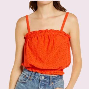 Airy eyelets bring breezy charm to this frill-trimmed tank cut in an easy cropped fit.