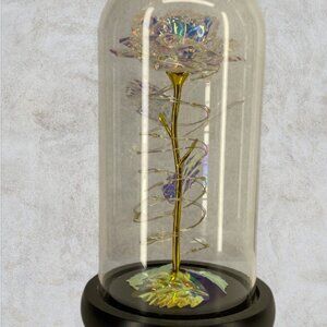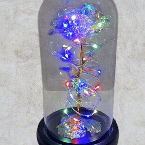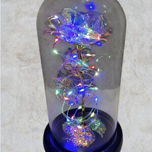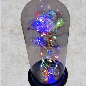 Bring a touch of timeless beauty and enchanting light to your home with this LED rose in its own glass dome. Featuring a delicately crafted metallic rose with shimmering petals, this piece is encased in a clear glass dome and set atop a sleek wooden base. The rose is intertwined with warm, colorful LED fairy lights, creating a captivating glow when switched on — perfect for adding romance to any room, or as a stunning centerpiece for special occasions. Battery-operated for easy placement anywhere, this LED rose makes a wonderful Valentine’s Day gift, anniversary present, wedding décor, Mother's Day or unique home accent. Whether lit or unlit, its beauty endures, symbolizing everlasting love and elegance.