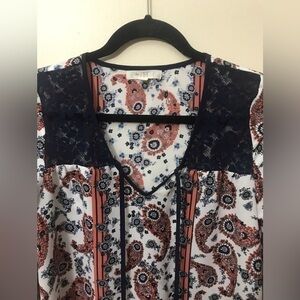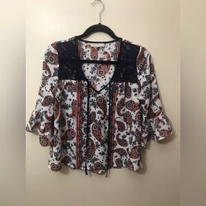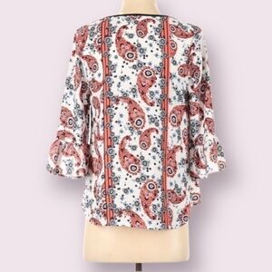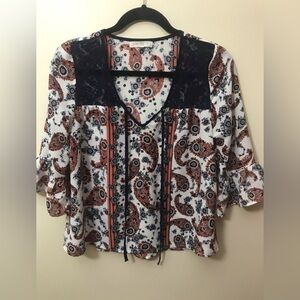 LOVE Fire Womens 3/4 Ruffle Bell Sleeves V-neck Boho Drawstring Blouse Top. Sz S