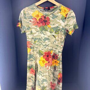 This short-sleeve maxi dress combines a unique camouflage pattern with vibrant floral designs. Crafted for comfort and style, it suits various occasions.
