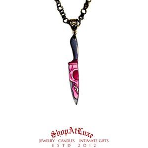 Newly handcrafted, our Love Killz Dagger Handwoven Necklace is with loaded symbolic meaning; the knife signifies severance, death, sacrifice, division, or liberation. In Buddhism, cutting with a knife represents deliverance, as in cutting the bonds of ignorance.