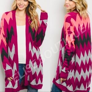 Long sleeve open front asymmetric stripes print mid-length knitted cardigan Oversized fit Very comfortable and cozy! So trendy for the upcoming fall season zig zag pattern