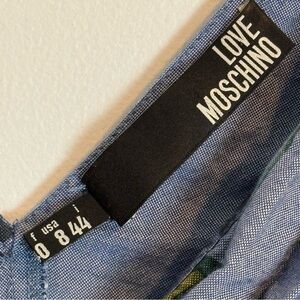 LOVE MOSCHINO BLUE COTTON FLORAL PRINT SLEEVELESS TOP BOW TIE BUTTON UP SZ 8