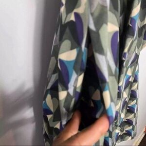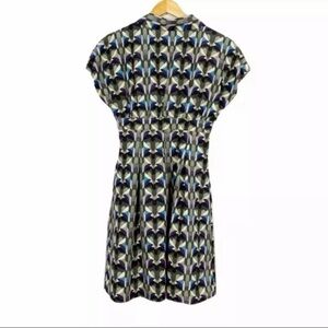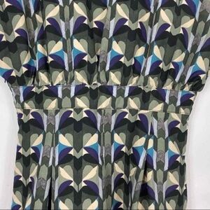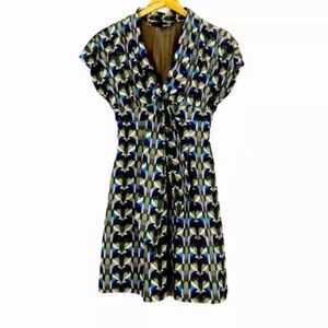Lovely fit & flare dress featuring floral kaleidoscope print design, tie neck collar, elastic stretch capped sleeve. Knee length. Half lined. Lightweight.
