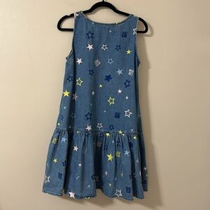Denim sleeveless dress detailed with embroidered stars and logo, seam pockets and flounced hem. 100% Cotton