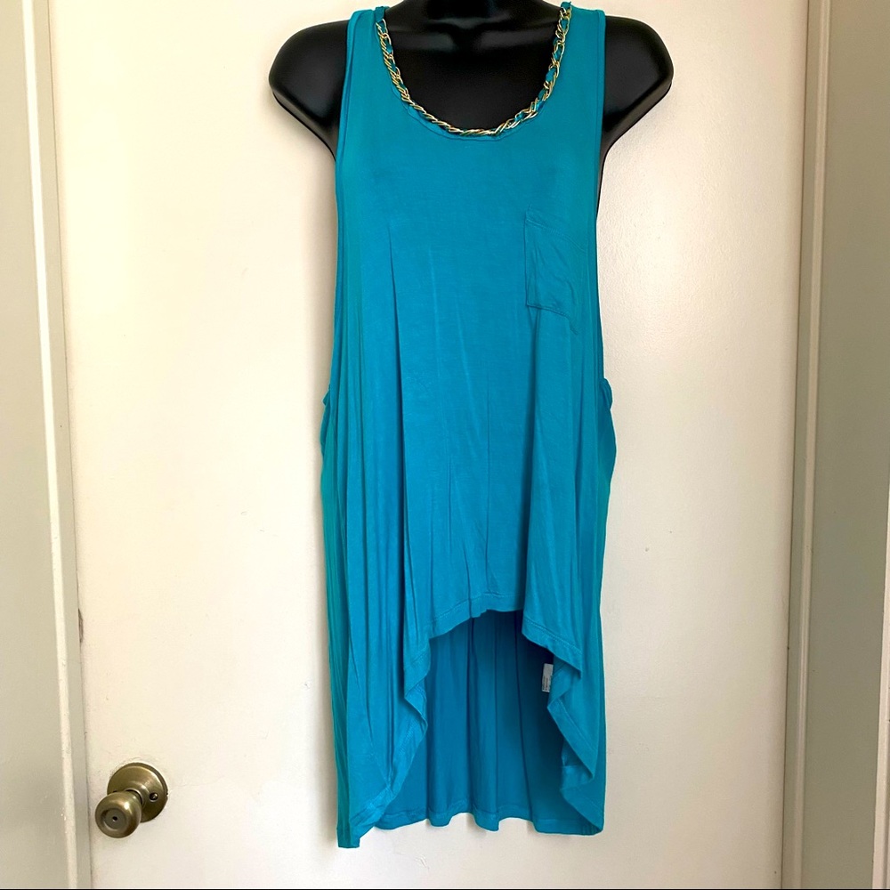 👚 The LOVE NATION TOP is Teal with a Gold Chain that Goes Around the Neckline that is a Beautiful Accent to the Top. It Has a Pocket on the Top Left Side. The Top is in Excellent Condition.