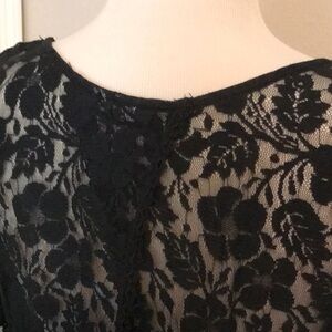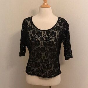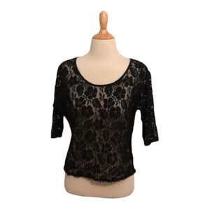 This sheer floral lace top has 3/4 sleeves and a split back. It is in great pre-owned condition and ready to wear. No flaws noted.