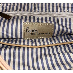 LOVE ONE LOVE ALL Sun Leather Cross Body Purse . Braided Accents with Large Tassel. Approximately 11 inches wide x 8 inches tall. Tan Leather , adjustable Shoulder Strap, Main Zipper Compartment with additional Zipper Compartment inside with other pouches. Preowned in like new condition. Feedback is always appreciated thanks for looking. Visit our store for more bargains and unique vintage items.