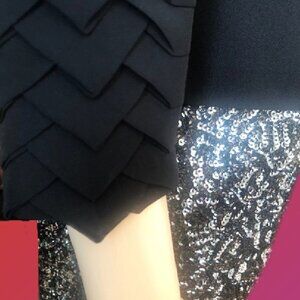 LOVE PARIS PARIS Retro gorgeous black blouse featuring expertly crafted folded weave motif layered on both sleeves. Black velvet stylized appliques on the front, back zipper closure, soft shoulder pads, bracelet length sleeves. Polyester/ Lycra blend Hand wash cold water. Very good condition. Bust 35 Inch, Length 20 Inch Size S.