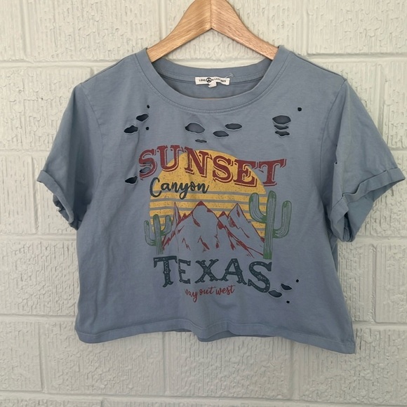 LOVE PEACE & LAZY DAYS WOMENS SUNSET CANYON TEXAS GRAPHIC CROP TEE