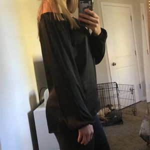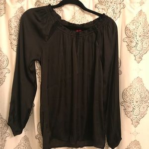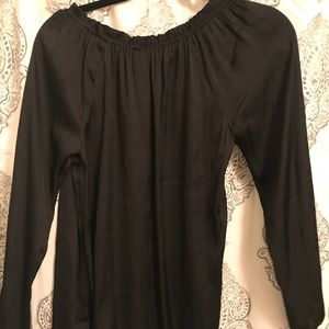 This satin feel off the shoulder top goes great with some distressed jeans for a casual everyday look or some nice pants for a more dressy look. Fits really well, has never been worn. The sleeves are ruched together where they hit your wrists adding a slight 70-80’s vibe to this top.
