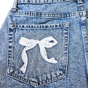 ●White eyelet lace bow appliqués on both back pockets