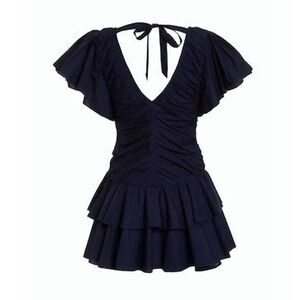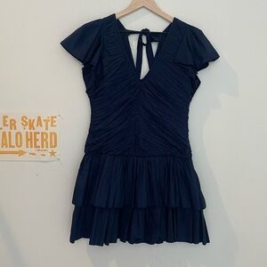 LOVE THE LABEL minette dress in cotton mini preppy V-Neck. Flattering ruching and V neck front and back. Flirty flutter sleeve with tie in back. Side zipper. Tiered ruffle mini dress bottom. Lined and in excellent worn once condition.