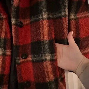LOVE TREE BURNED ORANGE PLAID TEDDY SHERPA COAT