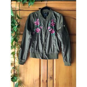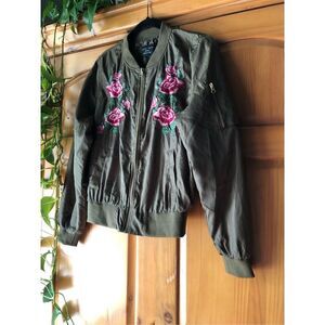 LOVE TREE Embroidered Bomber Jacket Embroidery Flowers Army Green Size M