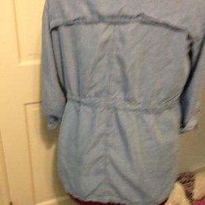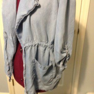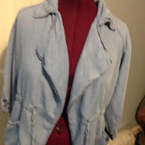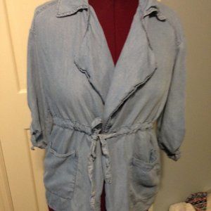 LOVE TREE LADIES SIZE LARGE OPEN FRONT JEAN VERY LIGHTWEIGHT JEAN STYLE JACKET. PULL STRING FOR CLOSURE AT WAIST. POCKETS ON SIDES, WITH 3/4 ROLL UP SLEEVES. 100% TENCEL, IS LIKE A VERY COMFY OVERSIZED SOFT FABRIC JACKET- FOR THE COOL MORNINGS. VERY CASUAL. MACHINE WASHABLE. PREOWNED BUT IN GREAT CONDITION. FROM A SMOKEFREE HOME.