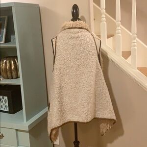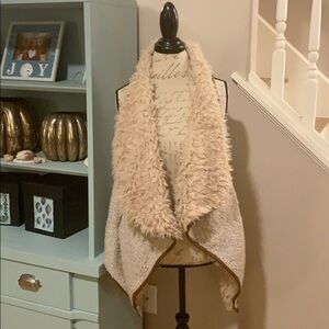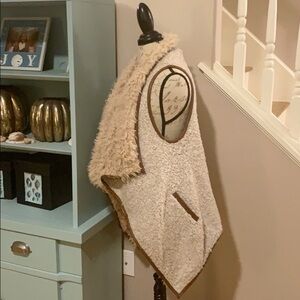 This is the softest coziest faux fur vest! Inner lining of the vest is a longer fur that shows w/ the flip over collar. The outer is a short faux Sherpa. Faux luggage colored leather lining around the edges & side pockets. Shell: 78% Acrylic, 18% wool, 4% Polyester. Lining: 100% Polyester. Dry clean only. Measures approximately: 19” armpit to armpit, 15 1/2” armpit to hem. Collages consist of stock photos of same vest, all other pics are actual vest. Excellent like new condition. See comments