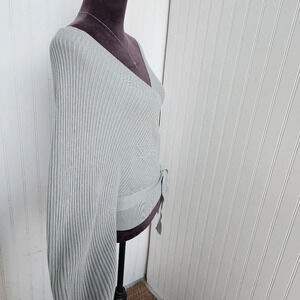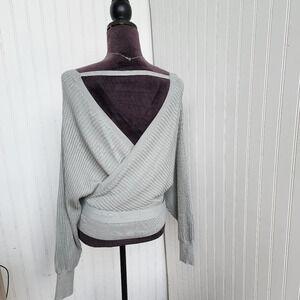 LOVE TREE V-NECK Cool Blue Wrap Sweater Ribbed Knit Gray Long Sleeves Tie Sz XL A2