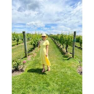 The LOVE WHIT Yellow Tie Back Dress is a breezy and effortlessly chic piece, perfect for warm-weather styling. Crafted from 100% cotton, this dress offers a lightweight and breathable feel for all-day comfort. Designed with a classic crewneck and short sleeves, it provides a relaxed yet polished look. The standout feature is the stylish tie-back detail, adding a touch of charm and versatility. Falling in a flattering silhouette, this Size Medium dress is ideal for casual outings, vacations, or weekend brunches, bringing a fresh and sunny vibe to any wardrobe.