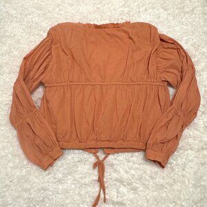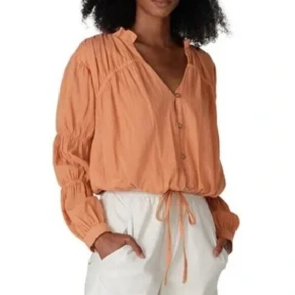 Washed cotton in sand stone color with gathered sleeves, drawstring bottom and button front.