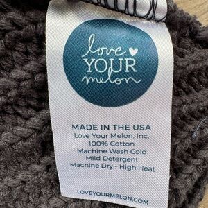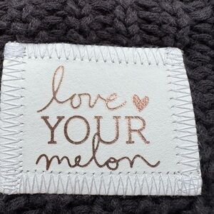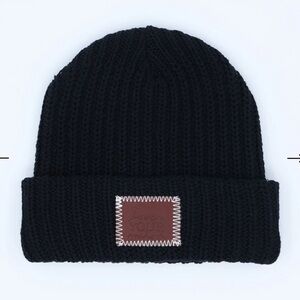 This black knit cuffed beanie features a white maple leather patch with a debossed Love Your Melon classic logo in gold foil.
