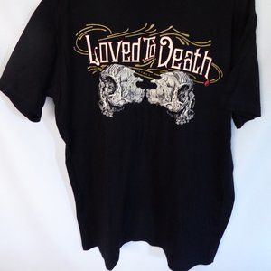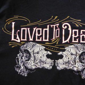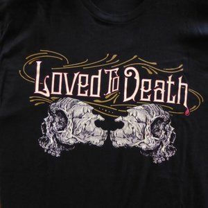 New, never worn, The Loved to Death curiosities & oddities store in San Francisco, CA. The front of the shirt graphics depict a profiles of 2 skulls. Item was purchased without tags at the store. (See photos for details.)