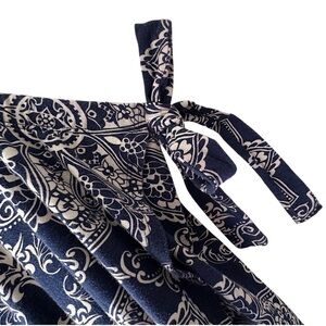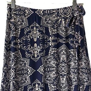 LOVEEPPELLA | NWOT MADYSON FAUX WRAP KNIT MIDI SKIRT NAVY BLUE MEDALLION | SMALL