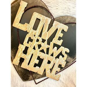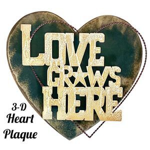• Design & Features: This features three-dimensional elements, as seen in the raised lettering of "LOVE GROWS HERE" in metal raised on a large distressed heart.
