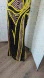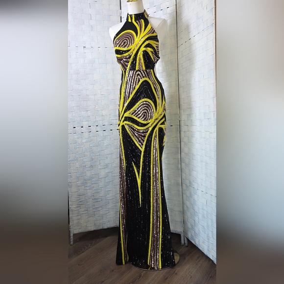 Stunning halter evening gown in black with vibrant yellow sequin accents. Figure-skimming silhouette with eye-catching swirl sequin pattern. Comfortable halter neckline finishes the design.This striking sequin prom dress features a bold black base adorned with vibrant neon yellow and metallic swirl patterns.