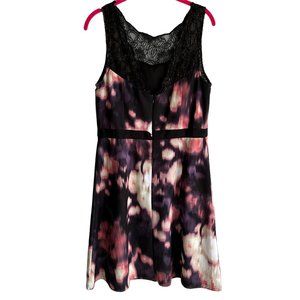 Lovely by Adrianna Papell navy and Pink Ladies Party Cocktail. Lovely Lace sleeves. This dress is in excellent condition except for two spots as shown on the last photos. There is a small white spot that is only noticeable when looking close and the other is the band on the waist is coming undone in the back.