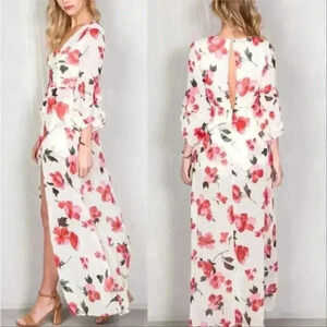 This floral maxi romper is simply stunning, with a plunging neckline, flirty open front maxi skirt, gathered sleeves detail, back keyhole, back button closure.