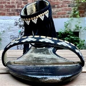 Looking for those perfect boho vibes? Look no further! These beauties feature an adjustable ankle strap for that ideal fit and a convenient heel zipper closure for easy on and off. Just a small chip on the front toe adds a touch of character to these stunning shoes.