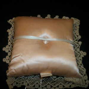 THIS IS SUCH A PRETTY PIECE IN PEACH. PEACH SATIN THAT IS. WITH LOTS OF LACE AND ROSETTES PLUS RIBBON. SIZE WISE IT IS 7 & 1/2 INCHES BY 7 & 1/2 INCHES. WITH A EXTRA 1 & 1/2 INCHES OF LACE ON THE SIDES. IT STILL HAS SOME SCENT OF SACHET. PLUS A BROCANTE TAG. WITH SOME WEAR YET PLENTY TO SHARE WITH YOU LUCKY BUYER. ENJOY THE PAST. 2ND GROUP. THANKS