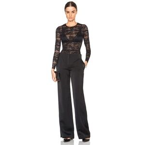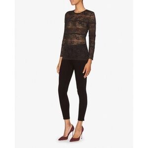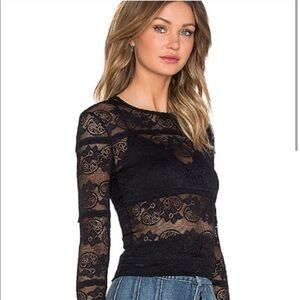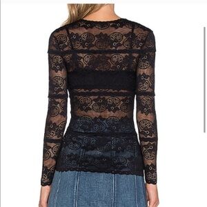 Making a lady-like statement in a fitted stretch long sleeve lace tee. Semi sheer. In black. Fabric: 90% nylon/10% spandex Model Measurements: Height 5'10; Waist 25"; Bust 34" wearing size 2 Length from shoulder to hem: 23"