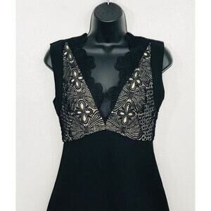 Details: Elegant formal/cocktail dress. Slimming pencil silhouette w/ placement lace detailing & delicate ribbon ties. Scallop detailing w/ champagne-tone camisole that peeks through the lace bodice. Plunging V neckline & back. Slim skirt w/ back vent. Invisible zip closure. Durable thickness in material.