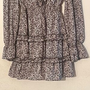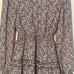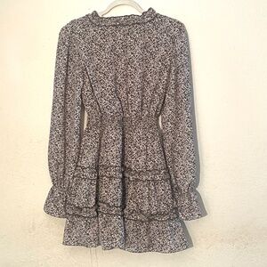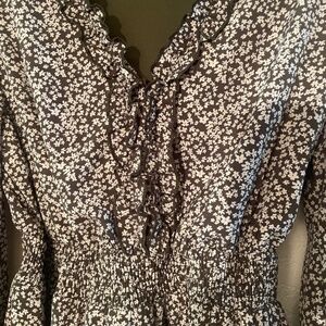 EUC with no flaws. Very pretty and feminine. Brown with cream colored/ white flowers. Elastic waist, ballon sleeve with ruffle detail at the wrist. Ruffle detail down the front of the dress and at the bottom. Very nice.lined. 100% Polyester. Machine wash with like colors , tumble dry low heat. Size large