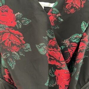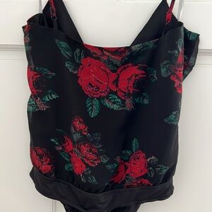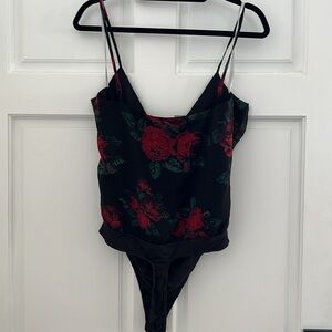 LOVERS + FRIENDS Bodysuit Strappy Splice V-Neck Front Black Red Rose Floral M