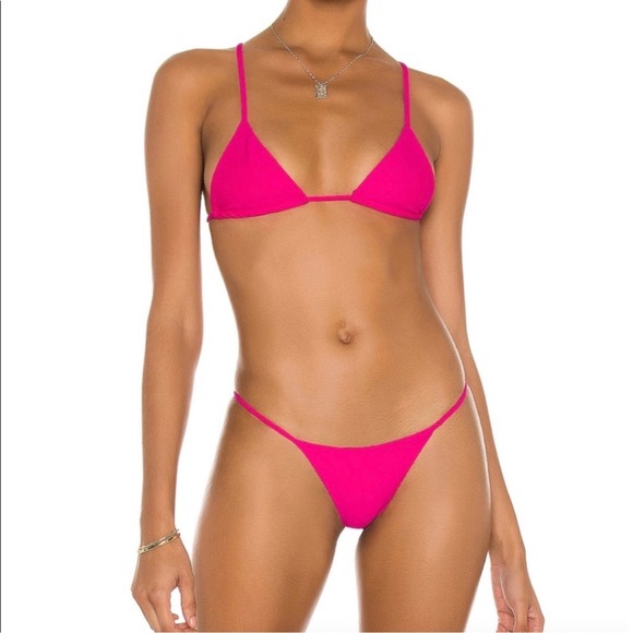 Turn heads with this vibrant neon pink bikini set from Lovers + Friends. The triangle halter top features adjustable strings for a perfect custom fit, offering ample support and a flattering silhouette. The matching string bikini bottoms provide minimal coverage for a daring look, with adjustable ties at the hips ensuring comfort and a personalized feel. This eye-catching set is ideal for making a statement at the beach, lounging by the pool, or enjoying a tropical vacation.
