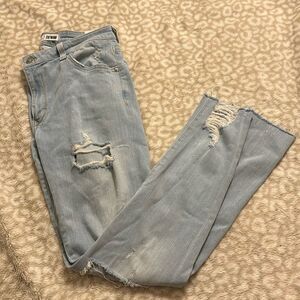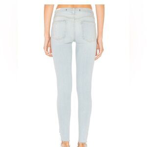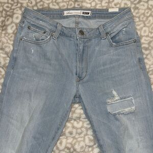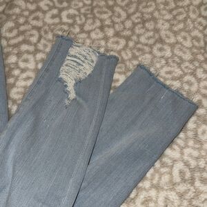 PERFECT CONDITION! Worn 1x. Light wash. Destroyed Detailing throughout Legs. Unfinished Leg Opening. Slim Flattering Look. Super Stretxhy. Buttery Soft! Raw Cut Hem. Front + Back Pockets. 12" at the knee narrows to 8" at the leg opening