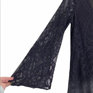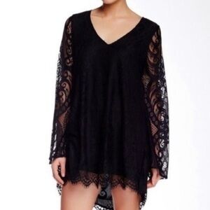 A classic and elegant little black dress with detailed lace bell sleeves. This fun and romantic piece is great for holiday parties and can be easily dressed down for casual wear as well. Shift dress featuring a lace overlay, long sheer bell sleeves, a slight high low hem and full lining.