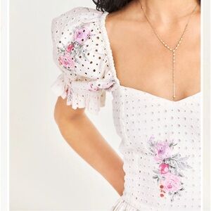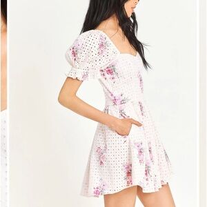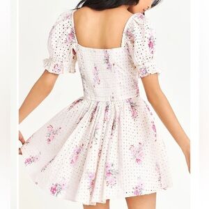 This airy mini features an ethereal eyelet cotton fabric with playful florals. The dress begins with short puff sleeves with elastic at the openings and a sweetheart neckline before falling to a smocked back that descends to a slightly pleated mini skirt with an a-line hem. The dress includes a side seam zipper for functionality.