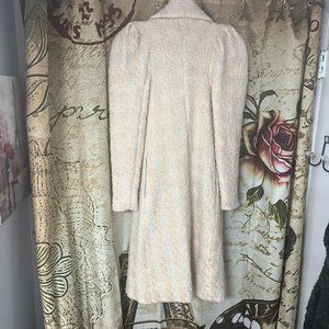 This vintage-style double-breasted knit jacket, which extends to the knee, has a proper collar, oversized pearl, and gold buttons and puffed sleeves.